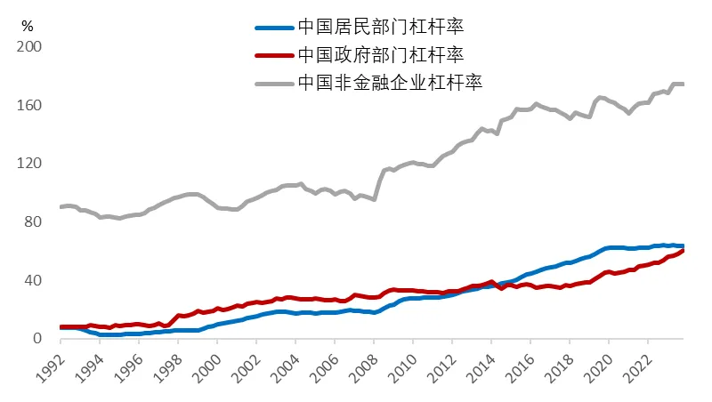 例如,我国企业部门(非金融)的杠杆率水平在2008年末为95%,到2024年9月就到了174.3%;我国居民部门的杠杆率水平在2008年末为17.9%,到2024年9月就到了63.5%,政府部门的杠杆率水平在2008年末为28.1%,到2024年9月就到了60.3%。