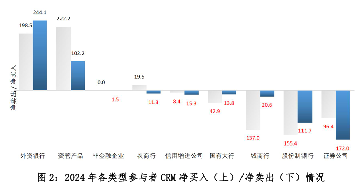 核心交易商展业占比超过九成,展业机构数量创历史新高。2024年,共有54家核心交易商和52家一般交易商参与CRM业务。CRM交易净买入主体更加集中在资管产品和外资银行,且外资银行成为最大净买入方。CRM交易净卖出主体类型相对分散,股份制银行、城商行和国有大行净卖出量显著下降,证券公司取代股份制银行成为最大净卖出方,农商行从净买入转为净卖出。