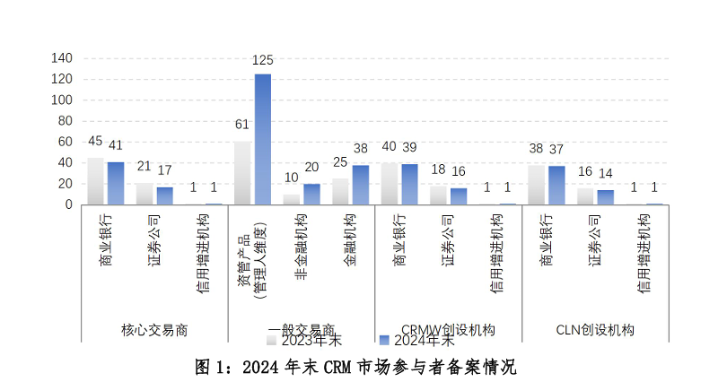 截至2024年末,CRM市场参与者合计242家。按照《关于完善信用风险缓释工具业务参与者管理有关事项的通知》(中市协发〔2024〕37号,以下简称《通知》)要求,2024年核心交易商进行首次动态调整,由67家调减为59家,信用风险缓释凭证(CRMW)和信用联结票据(CLN)创设机构分别调减至56家和52家。同时,《通知》将一般交易商备案优化为信息登记,效率大幅提升,备案数量接近翻倍,由2023年末的96家迅速增至183家,增幅达91%。其中,资管产品管理人125家(含903只产品),新增64家;非金融企业20家,新增10家;金融机构共38家,新增13家。