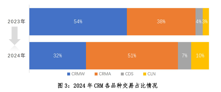 截至2024年末,CRMW存续名义本金为446.93亿元,较去年末下降27%;CRMA存续名义本金为411.62亿元,较去年末增长31%;CDS存续名义本金为18.69亿元,较去年末增长73%;CLN存续名义本金为79.67亿元,较去年末增长105%。