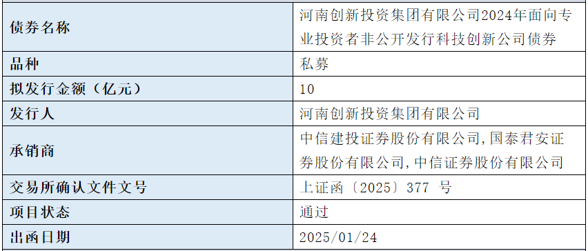【大河财立方消息】1月28日消息,河南创新投资集团有限公司2024年面向专业投资者非公开发行科技创新公司债券项目,已获上交所通过。