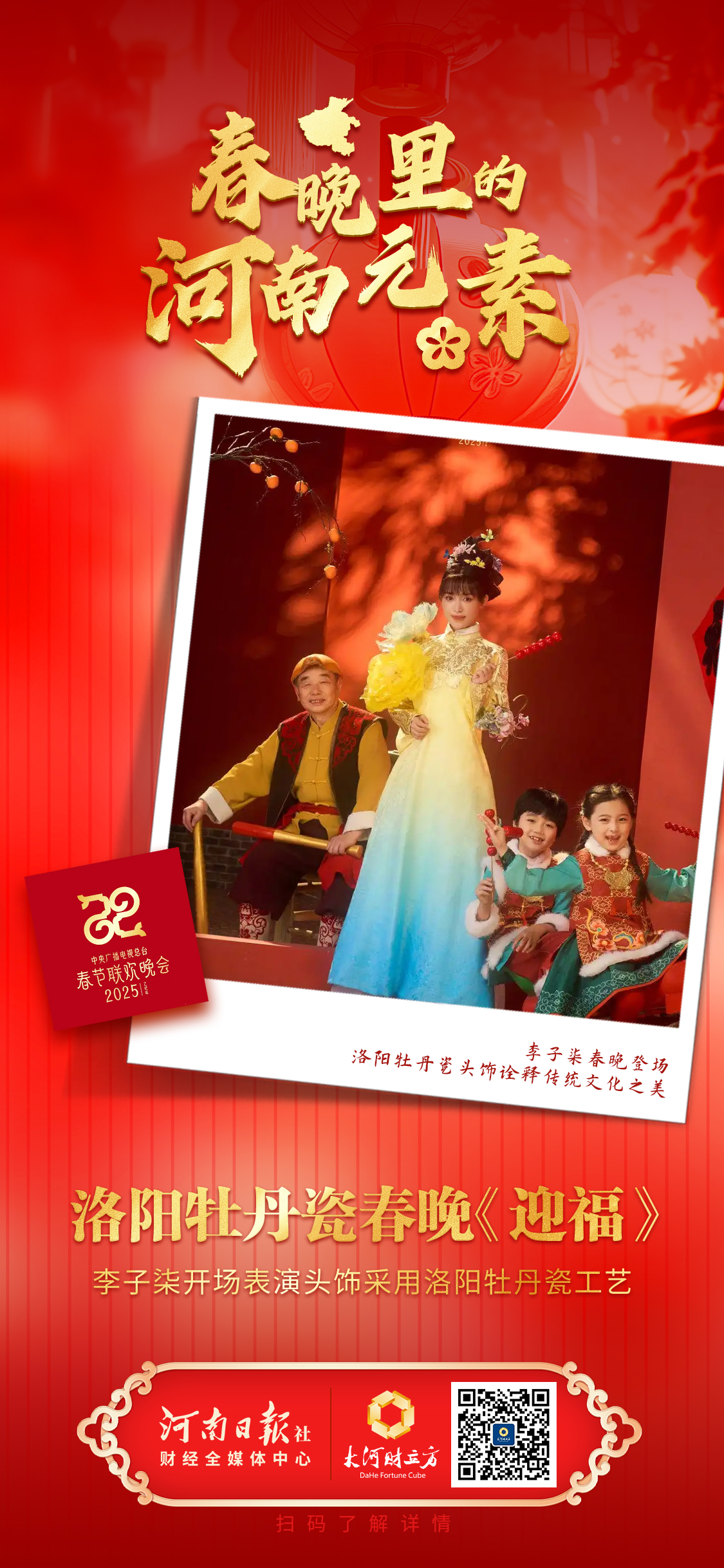 【大河财立方 记者 朱娟】1月28日晚8点,中央广播电视总台“2025年春节联欢晚会”如期而至。今年是“春节”申遗成功后的首届总台春晚,晚会一开场,李子柒身着带着全国各个不同地区非遗元素的服饰亮相。这件服饰由李子柒与全国多地非遗传承人共同创作,其中,她头上的桂花发饰采用了洛阳牡丹瓷工艺。