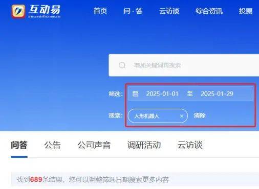 受相关概念大涨带动,人形机器人也成为近期互动平台上的热门词。比如深交所互动易上,按人形机器人搜索,近一年就有3889条检索结果,其中2025年首月有689条,占比17.7%。而上证e互动近一月有关于人形机器人的检索结果有240条。