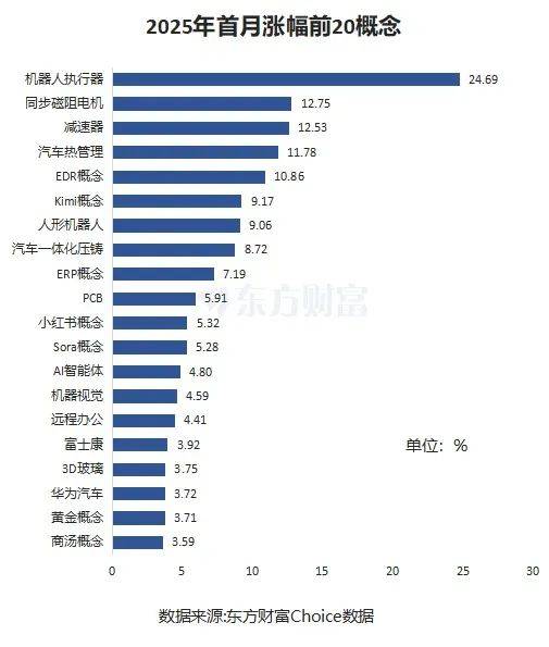 东方财富Choice数据显示,2025年首月涨幅靠前的概念多数与机器人产业链有关。比如涨幅首位的是机器人执行器,2025年首月大涨24.69%。紧随其后的是同步磁阻电机,首月上涨12.75%。减速器排在第三,涨了12.53%。而《秧BOT》引发大家热议的人形机器人概念,2025年首月涨了9.06%,排在概念涨幅榜第七位。