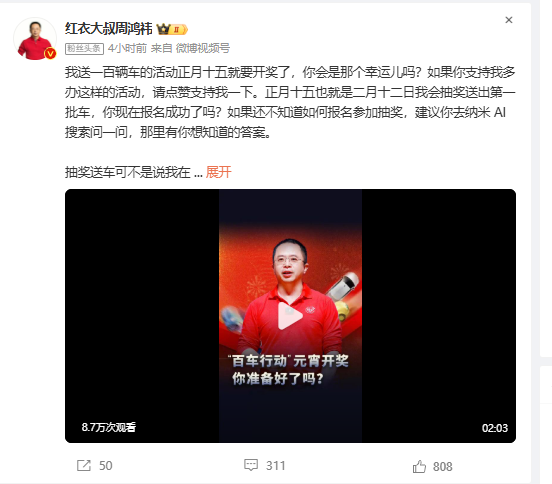 【大河财立方消息】1月31日,360集团创始人周鸿祎在社交平台发文表示,其送一百辆车的活动将于2月12日(正月十五)开奖。