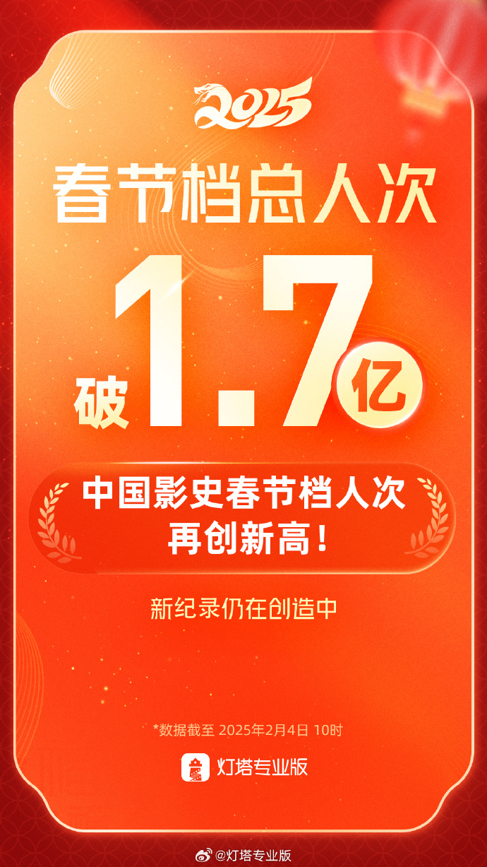 【大河财立方消息】据灯塔专业版,截至2月4日10时,2025年春节档(1月28日-2月4日)总人次突破1.7亿,刷新中国影史春节档人次最高纪录。
