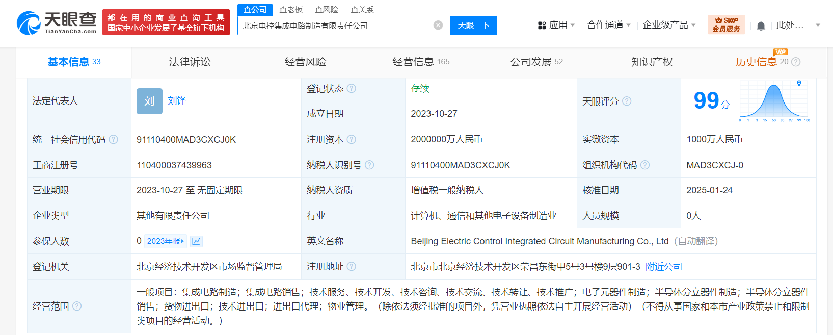 北京电控集成电路制造有限责任公司成立于2023年10月,法定代表人为刘锋,经营范围含集成电路制造、集成电路销售、电子元器件制造、半导体分立器件制造、半导体分立器件销售、货物进出口、技术进出口等。