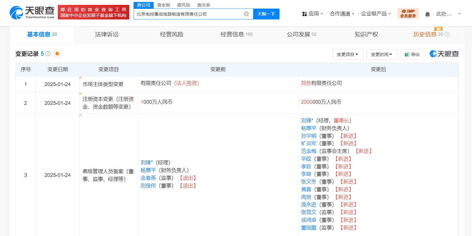 【大河财立方消息】天眼查App显示,近日,北京电控集成电路制造有限责任公司发生工商变更,新增北京国有资本运营管理有限公司、北京亦庄科技有限公司等多位股东,同时,注册资本由1000万人民币增至200亿人民币,增幅199900%。