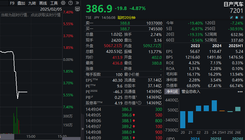 东京交易所暂停日产汽车股票交易。此前,日产汽车短线跳水,一度跌超5%。