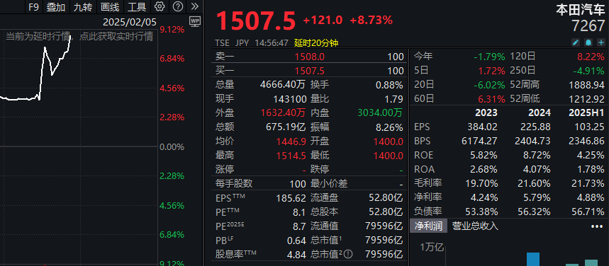 本田汽车股价则短线拉升,涨幅扩大至8.73%。