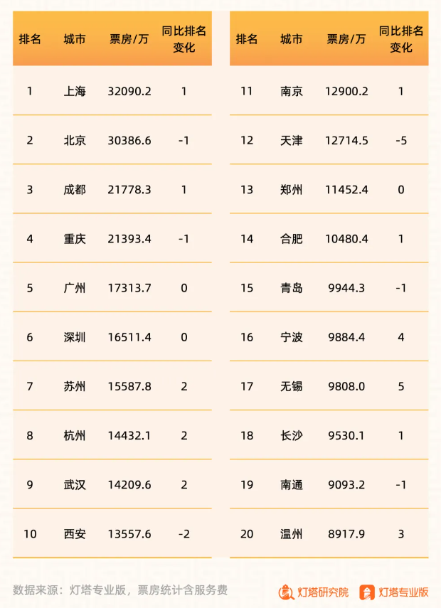 2月5日,灯塔研究院发布的《2025年春节档电影市场洞察报告》显示,档期内共有14个城市票房过亿,其中上海以3.21亿元的票房居城市票房榜榜首,郑州以1.15亿元的票房居全国第13位。