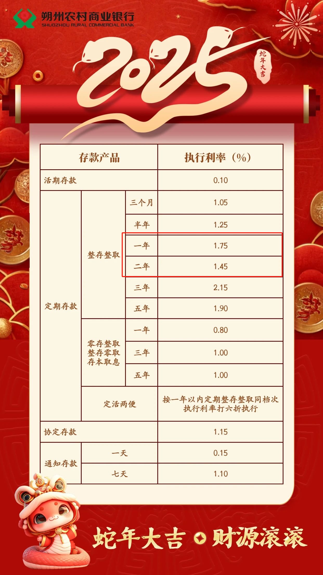 依据公告,自2025年1月22日起,朔州农商银行对一年期、三年期存款利率进行调整。其中,1年期“整存整取”存款利率为1.75%,而2年期利率却为1.45%。