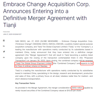 根据合并协议,此次合并对价为4.5亿美元,将以合并公司新发行的证券支付,按每股10美元计价。该交易预计将于2025年中期完成,合并后的公司将更名为“Tianji Tire Global Group (Cayman) Limited”。