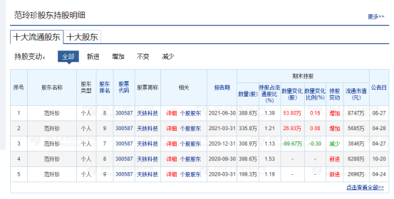 股东明细显示,2020年第一季度至2021年第二季度期间,范玲珍曾为天铁科技前十大流通股东。