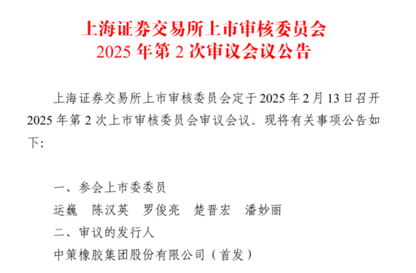 2月7日,上交所网站信息显示,2025年第2次上市审核委员会审议会议将于2月13日召开,届时将审议中策橡胶的首发事项。
