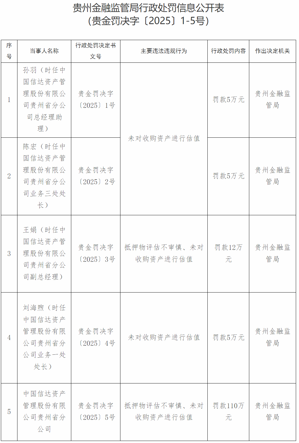 【大河财立方消息】2月10日消息,贵州金融监管局公布的行政处罚决定书显示,中国信达资产管理股份有限公司贵州省分公司因存在抵押物评估不审慎、未对收购资产进行估值的违法违规行为,被处罚款110万元。