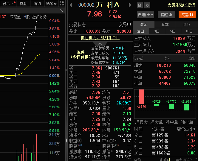 【大河财立方消息】2月12日下午,万科股票盘中直线拉升。
