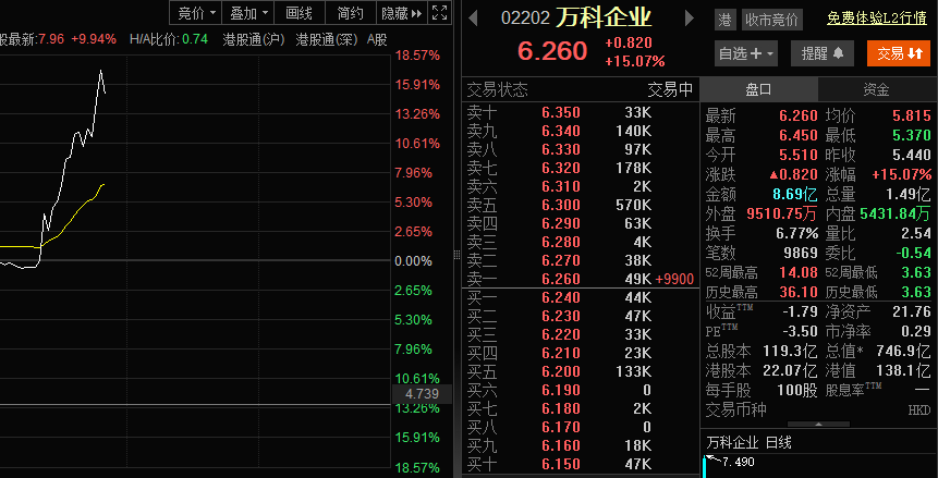 截至发稿,万科A上涨8.43%,港股万科企业上涨11.4%。