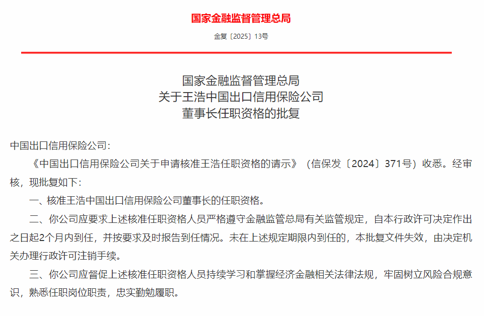 【大河财立方消息】2月12日消息,国家金融监督管理总局日前批复,核准王浩中国出口信用保险公司董事长的任职资格。
