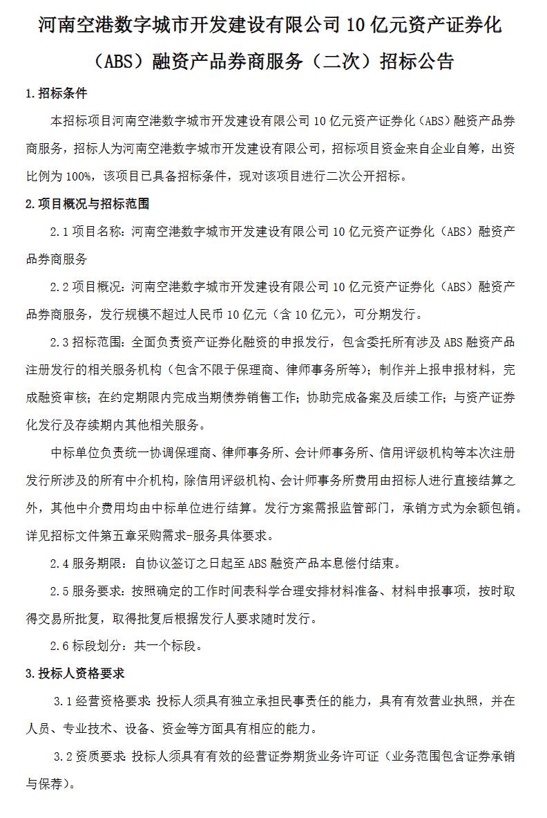 【大河财立方消息】2月14日消息,河南空港数字城市开发建设有限公司就资产证券化(ABS)融资产品券商服务进行二次招标。