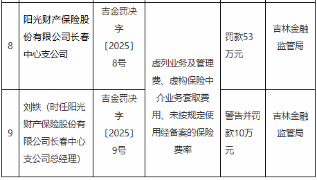 【大河财立方消息】2月18日,吉林金融监管局日前披露行政处罚信息公示表显示,阳光财产保险股份有限公司长春中心支公司因虚列业务及管理费、虚构保险中介业务套取费用、未按规定使用经备案的保险费率,被吉林金融监管局罚款53万元。