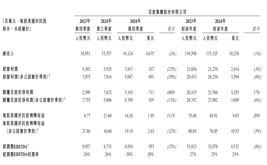 【大河财立方消息】2月18日,百度集团披露2024年业绩。全年,百度实现总营收1331.25亿元,同比增长1%;归母净利润237.6亿元,同比增长17%。
