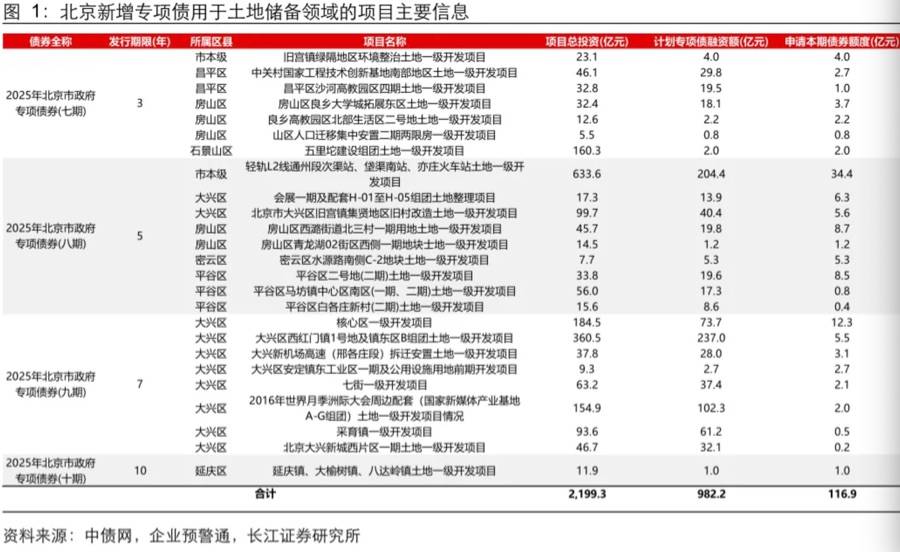 据长江证券首席宏观分析师于博梳理统计,北京这一批债券中用于土地储备的资金规模约117亿元,债券发行期限包括3年、5年、7年、10年。这批公示的土储项目总投资规模约2199亿元,计划专项债融资规模为982亿元。