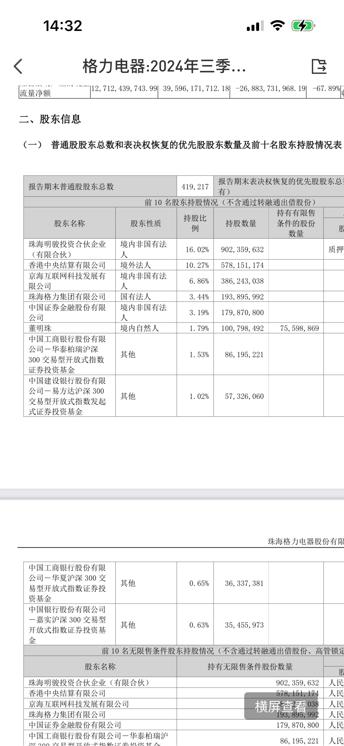 目前,格力电器是无实际控制人的企业,珠海明骏投资合伙企业(有限合伙)在格力电器中持股16.27%,为第一大股东;格力核心经销商的合资公司京海互联,在格力电器中持股6.97%,为第三大股东。格力电器2024年三季报显示,董明珠持有格力电器100798492(约1亿)股股票,在格力电器的持股比例为1.79%,是格力电器第六大股东。此外,格力电器曾公告透露,董明珠与珠海明骏是一致行动人士。(记者:王珍)