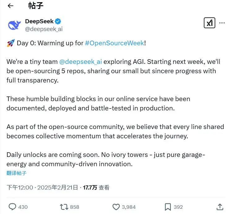 2月21日,DeepSeek在社交平台X发文称,构建了一支探索AGI(通用人工智能)小团队,从下周起将开源5个代码库,以完全透明的方式分享研究进展。
