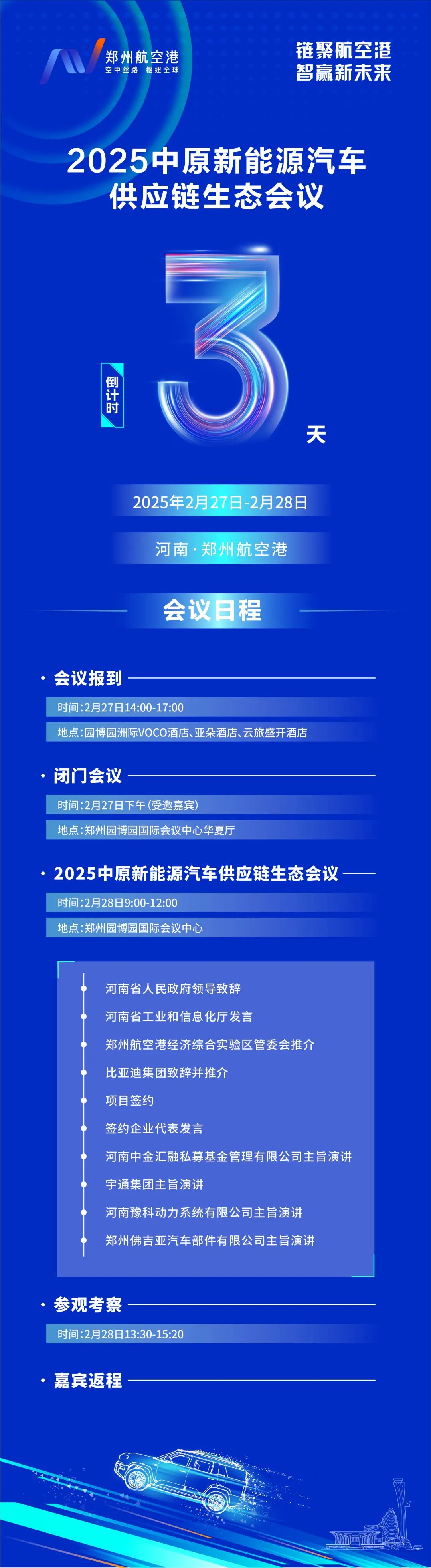 【大河财立方消息】产业发展,链上行动。为助力航空港区新能源汽车产业发展,2025年2月27日-2月28日,以“链聚航空港·智赢新未来”为主题的“2025中原新能源汽车供应链生态会议”将在航空港区举办。