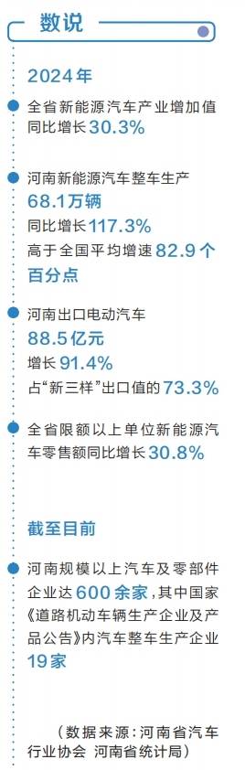 新能源汽车产业从无到有、从有到优,正成为河南新的经济增长极。2024年,全省新能源汽车产业增加值同比增长30.3%,出口电动汽车88.5亿元,增长91.4%。