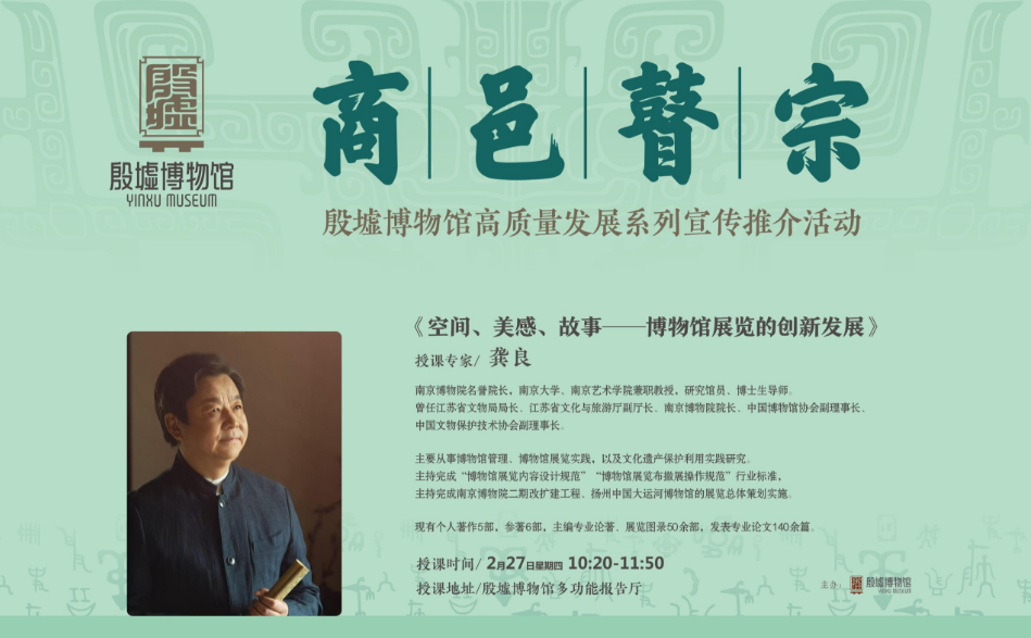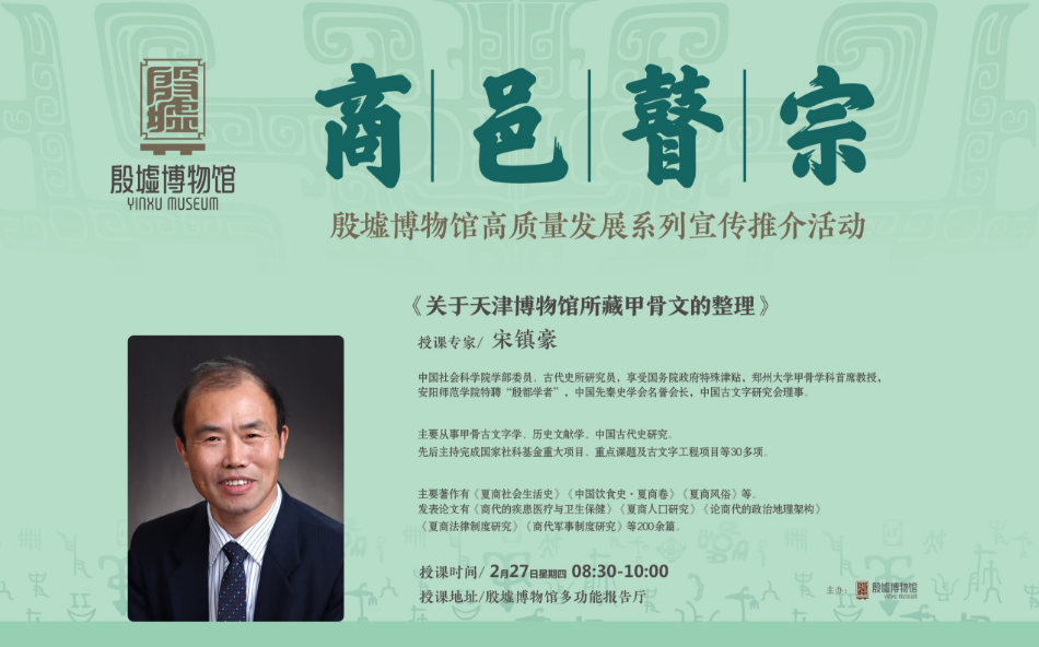 2月27日上午,邀请中国社科院学部委员、郑州大学甲骨学学科首席教授宋镇豪;南京博物院原院长、博物馆学专家龚良分别带来《关于天津博物馆所藏甲骨文的整理》《空间、美感、故事——博物馆展览的创新发展》专题讲座。讲座不仅面向专业人士,也欢迎广大文化爱好者前来聆听,为公众提供了一个近距离接触学术前沿、感受殷商文化魅力的绝佳机会。