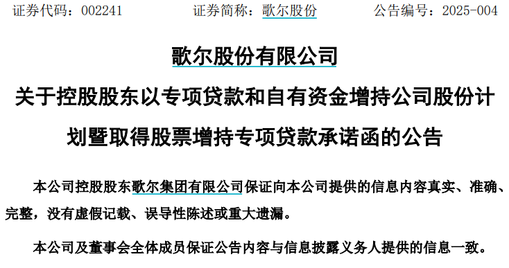 歌尔集团本次增持采用股票增持专项贷款与自有资金相结合的方式。兴业银行潍坊分行为歌尔集团提供了金额为不超过9亿元,且贷款比例不超过增持金额90%的专项贷款,贷款期限为不超过三年。
