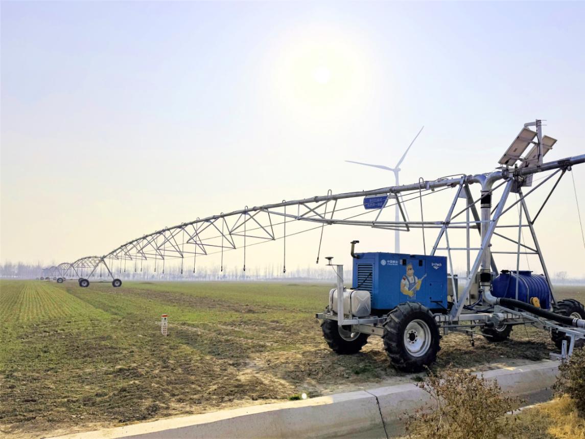 (图为河南兰考仪封镇高标准农田示范区,指针式大型喷灌机智能化灌溉作业。秦济远/摄)