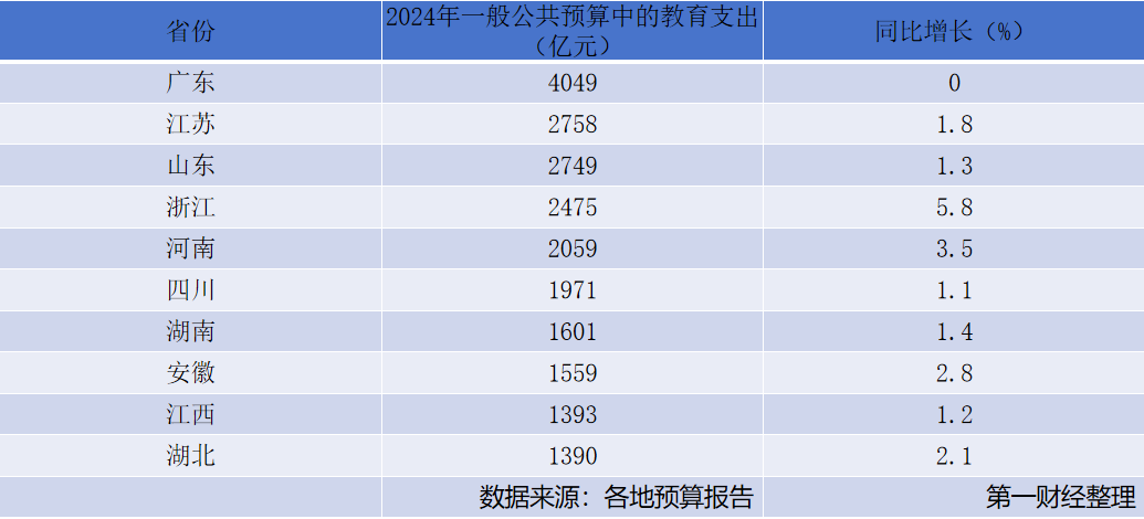 根据三省预算报告,江苏、山东和浙江预计2025年当地教育支出分别为2770亿元、2791亿元和2449亿元,分别同比增长0.4%、1.5%和1%。