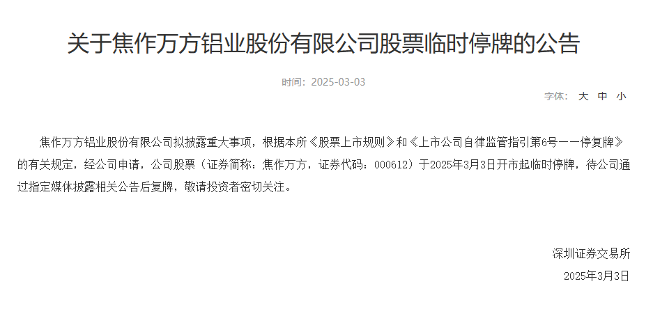 【大河财立方消息】3月3日,深交所公告,焦作万方铝业股份有限公司拟披露重大事项,经公司申请,公司股票(证券简称:焦作万方,证券代码:000612)于2025年3月3日开市起临时停牌,待公司通过指定媒体披露相关公告后复牌。
