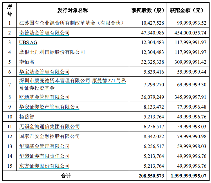 此次发行对象最终确定为15名,锁定期为6个月。具体包括江苏国有企业混合所有制改革基金(有限合伙)、诺德基金、UBS AG、摩根士丹利国际股份有限公司、李怡名、华宝基金、深圳市康曼德资本管理有限公司—康曼德271号私募证券投资基金、财通基金、华安资管、杨岳智、无锡金鸿通信集团有限公司、国泰君安金融控股有限公司、华商基金、华鑫证券、东方证券。