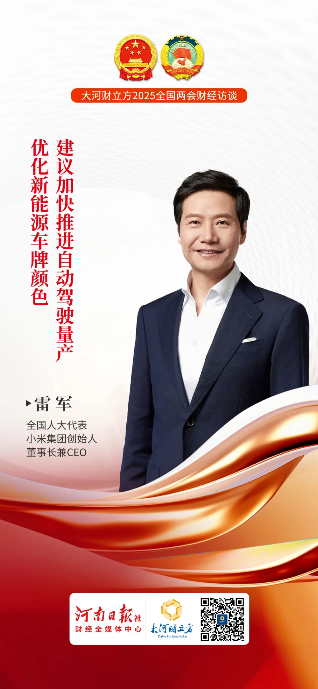 3月4日,大河财立方记者从小米集团获悉,全国人大代表、小米集团创始人、董事长兼CEO雷军,今年主要关注加快推进自动驾驶量产、发展智能网联新能源汽车产业生态、加快推进人工智能终端产业高质量发展、优化新能源汽车号牌设计和加强“AI换脸拟声”违法侵权重灾区治理等。