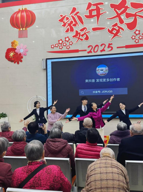 随后志愿者们又带领老人做“手部健身操”,合唱《东方红》,40余位老人热情互动。最后志愿者们围坐在老人身边,用通俗易懂的语言,讲解反诈骗、反洗钱等金融知识,帮助老人提高金融安全意识,守护好“钱袋子”。