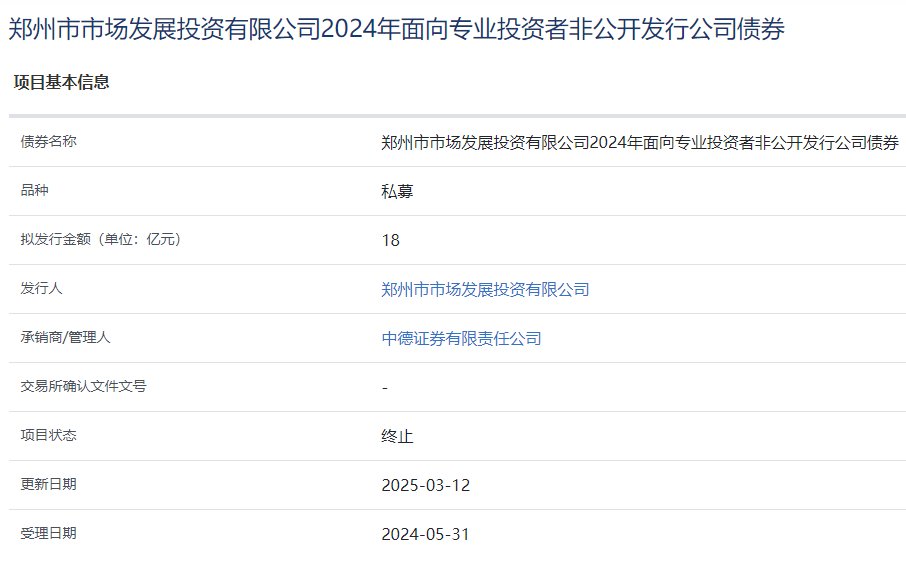 【大河财立方消息】3月12日,上交所债券项目信息平台显示,郑州市市场发展投资有限公司2024年面向专业投资者非公开发行公司债券项目状态更新为“终止”。