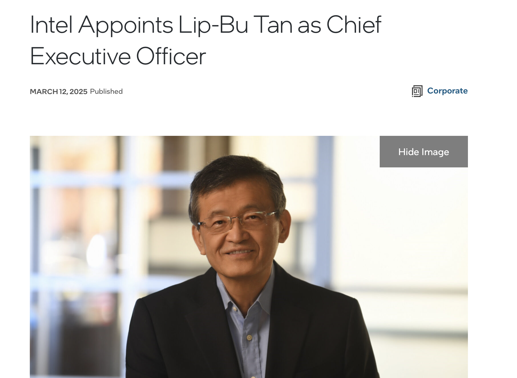 3月13日,英特尔(INTC.US)宣布,董事会已任命陈立武(Lip-Bu Tan)为公司新任首席执行官,该任命自3月18日起生效。他将接替临时联合首席执行官大卫・辛斯纳(David Zinsner)和米歇尔・约翰斯顿・霍尔索斯(Michelle Johnston Holthaus)的工作。