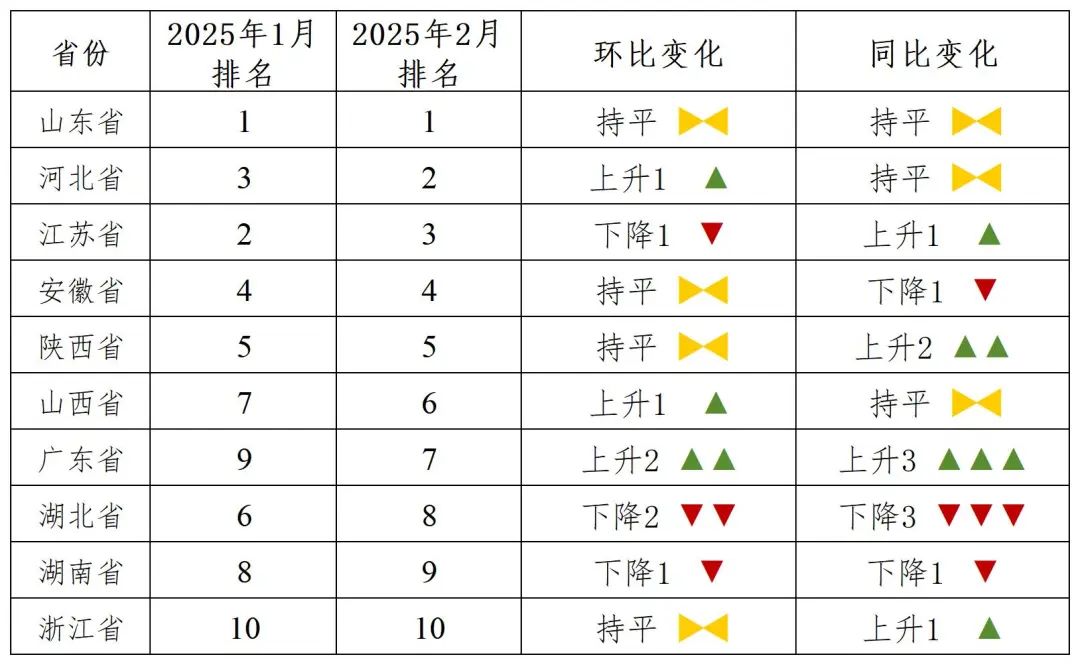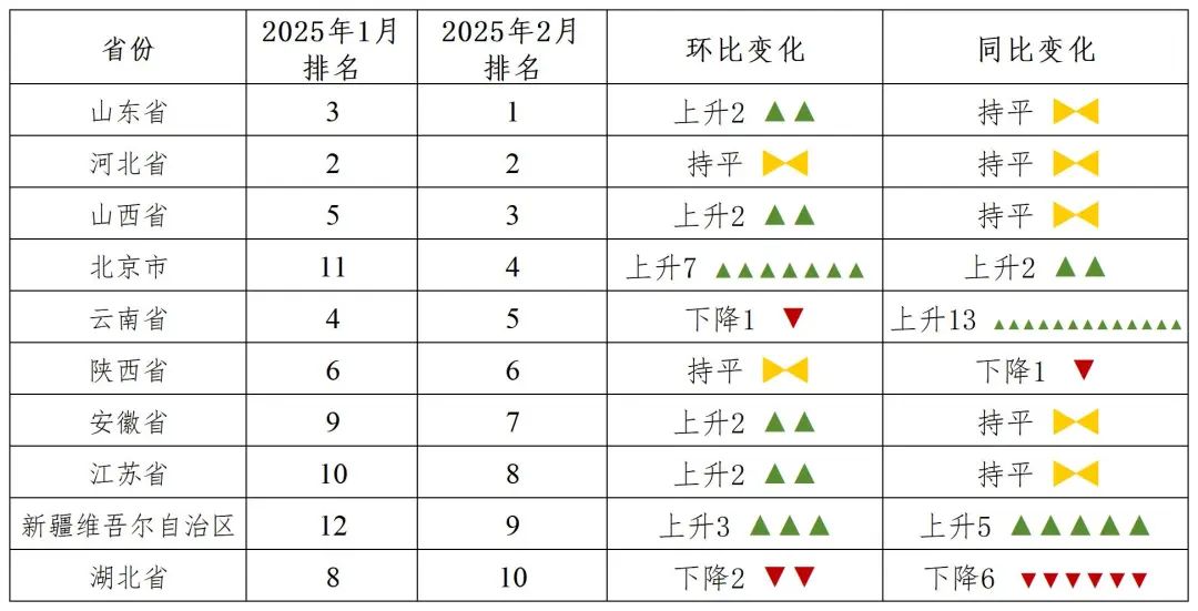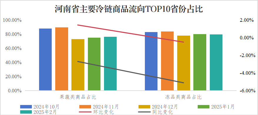 从河南省主要冷链商品流向区域来看,2月份,果蔬冷链商品主要流向周边省份,而冻品冷链则依然以东南方向为主。果蔬冷链流向前十省份的货量占比达到76.45%,同比降低2.70%;冻品冷链流向前十省份的货量占比为79.80%,同比降低5.12%。