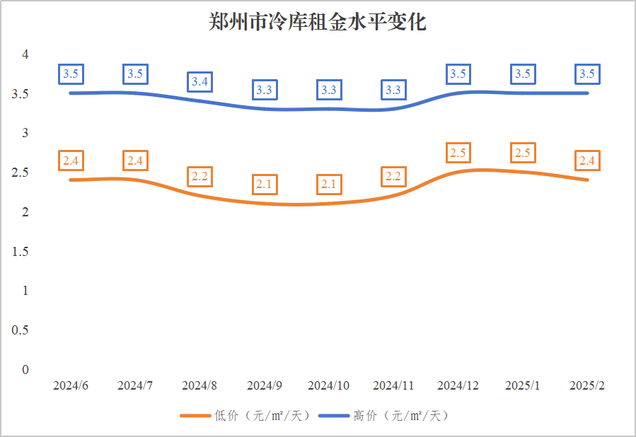 冷库市场需求与供应链的稳定性紧密相连,冷库服务的稳定性和价格波动会对全供应链的效率及成本控制产生直接影响。2月份,郑州市冷库租金低价为2.4元/㎡/天,相较去年8月份上涨9.09%,同比去年2月份上涨9.09%;租金高价为3.5元/㎡/天,相较去年8月份增长2.94%,同比去年2月份下跌2.78%。郑州稳固冻品集散中心地位,冷库租赁竞争激烈。
