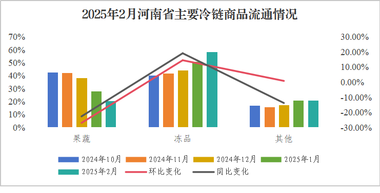 当前,河南省的冷链商品运输可大致分为三类,即果蔬冷链运输、冻品冷链运输以及其他商品的冷链运输。报告显示,2月,果蔬冷链商品主要包括菇类、大蒜、菠菜、白菜、蒜薹、红薯、韭菜、葡萄、草莓、榴莲、芹菜,以及其他果蔬;冻品冷链商品则以冻肉(猪肉、牛羊肉、鸡鸭肉等)、汤圆面点、雪糕冰淇淋、丸滑类预制食材及其他预制食材为主。