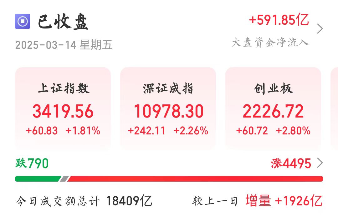 【大河财立方消息】3月14日,A股三大指数放量反弹,沪指收涨1.81%,收复3400点,创年内新高;深证成指涨2.26%,创业板指涨2.8%。全市场成交额18409亿元,较上日放量1926亿元,近4500只个股飘红。