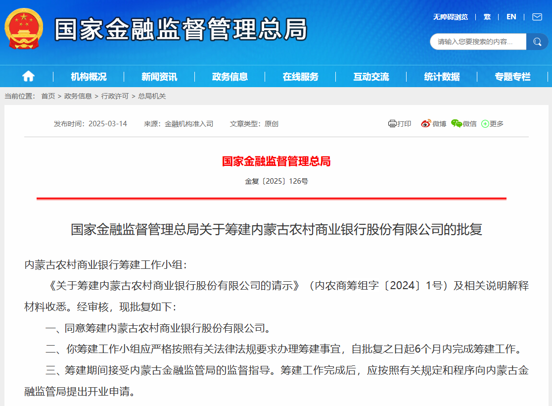 【大河财立方消息】3月14日,国家金融监管总局批复,同意筹建内蒙古农村商业银行股份有限公司。