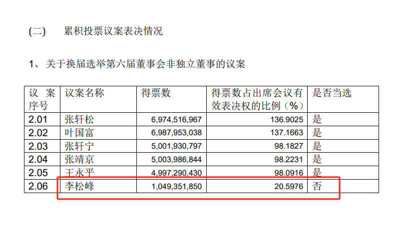 该议案同意票7票、反对票1票、弃权票0票。董事张轩宁反对。理由如下:当前高级管理议案中,未涉及CEO安排,这令人深感忧虑。张轩宁公告中提到,在董事兼CEO李松峰任职期间,他展现出了非凡的领导才能与卓越的战略眼光。他带领团队深入学习胖东来模式,并成功在全国推广永辉品质零售店,这一举措在市场上引起了巨大反响,不仅深受广大用户的青睐,也赢得了公司员工的爱戴。