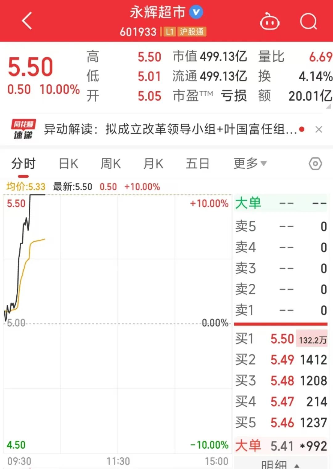 3月18日,永辉超市盘中10%涨停。