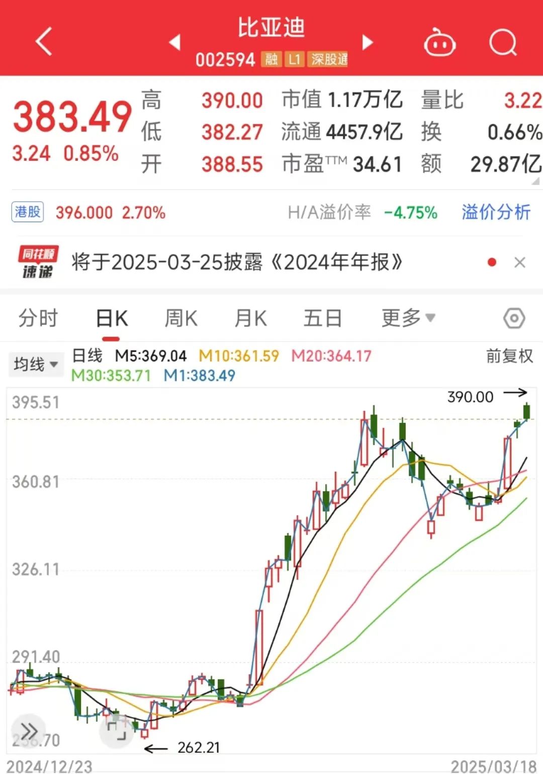 3月18日,比亚迪AH股齐创新高,港股比亚迪股份盘初一度涨6%报408.8港元,再创历史新高;A股比亚迪一度涨超2%报390元,同创历史新高。
