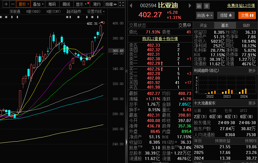 3月20日开盘,比亚迪股价直线拉升。截至发稿,其股价上涨1.31%,报402.27元/股,首次突破400元大关。